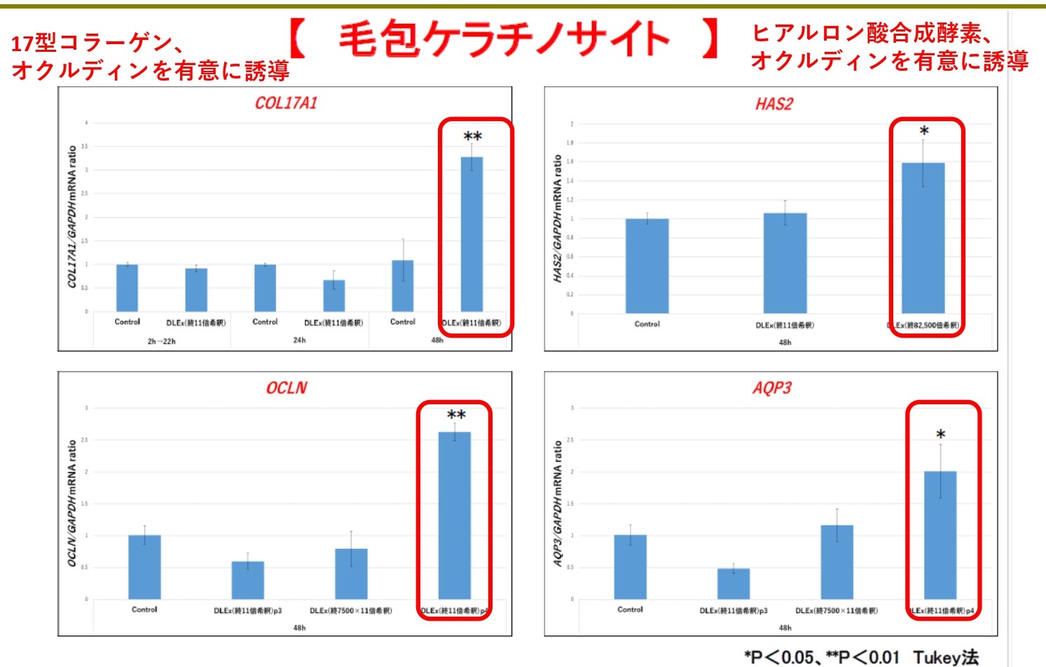 ●17型コラーゲンの産生を促進することが実証されました 。これにより、育毛、皮膚バリア効果、および脱毛・白髪防止への効果が期待できます 。